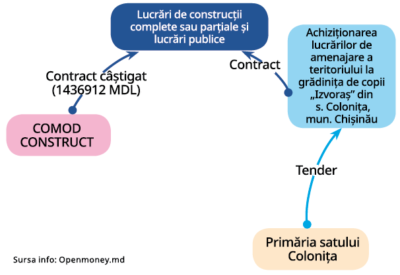 Bunăoară, în anul 2022, primăria Colonița din municipiul Chișinău a încheiat un contract de achiziții cu firma „Comod Construct” SRL pentru reparația clădirii Centrului de Sănătate Publică din localitate. După căutarea în platforma OpenMoney.md, vedem însă că anterior, firma „Comod Construct” a încheiat un alt contract de achiziții cu primăria din Colonița pentru efectuarea lucrărilor de reparație la grădinița „Izvoraș” din localitate.