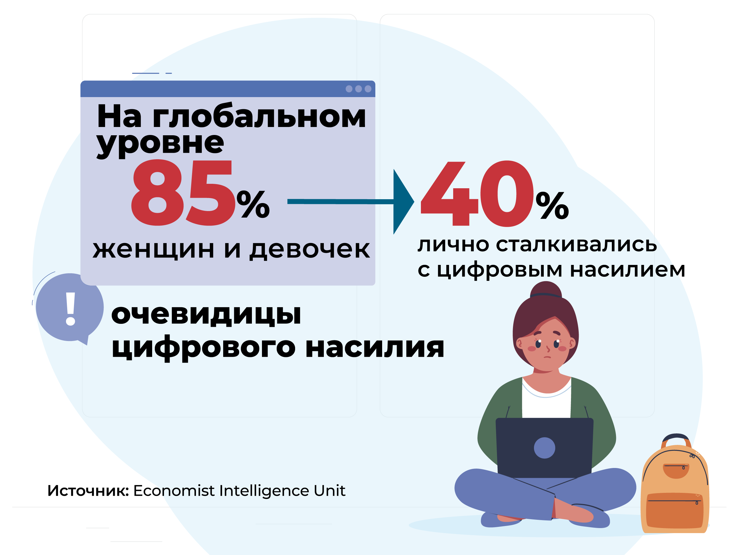 Potrivit studiului realizat de Economist Intelligence Unit, la nivel global, 85% dintre femei și fete au declarat că au fost martore ale violenței digitale, iar aproape 40% dintre ele au experimentat-o personal.