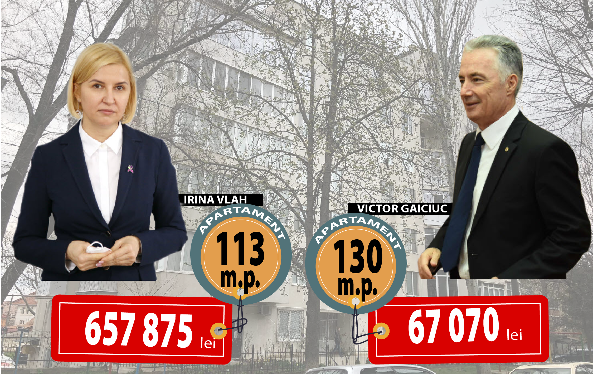 Guvernatoarea Autonomiei Găgăuze, Irina Vlah, și ministrul Apărării, Victor Gaiciuc, sunt vecini într-un bloc din sectorul Botanica al mun. Chișinău, construit cu aproximativ 15 ani în urmă. Ambele locuințe au câte trei camere, o suprafață ce depășește 100 de metri pătrați și ambele au fost cumpărate de părinții pensionari, apoi donate celor doi demnitari. Deși e mai mare decât al bașcanei, apartamentul ministrului e de zece ori mai ieftin, potrivit declarației de avere a acestuia, și ar valora în jur de 3 mii de euro. Ambii demnitari au explicat pentru Moldova Curată detalii legate de imobilele pe care le-au primit prin donație.